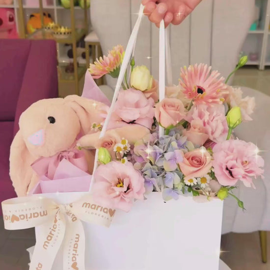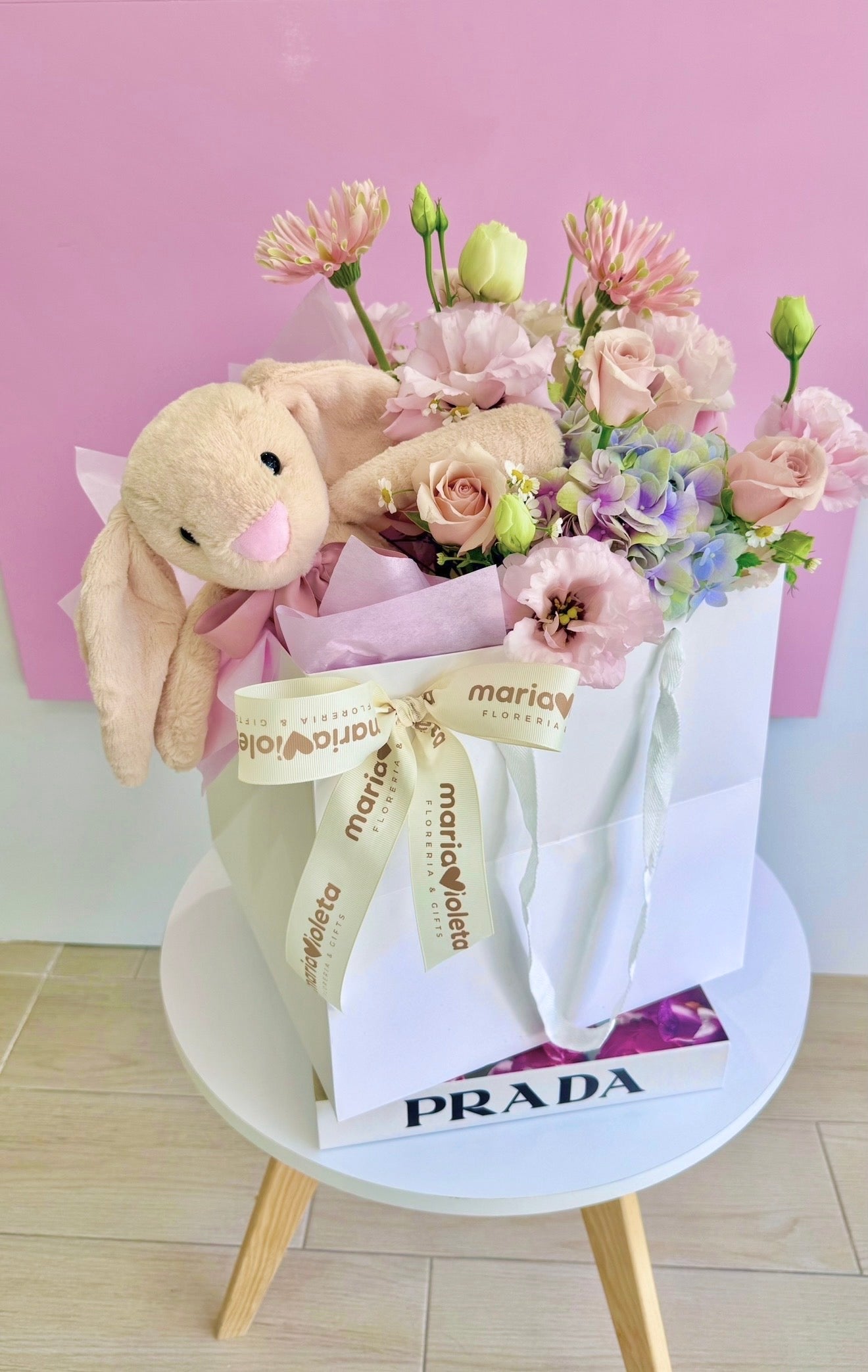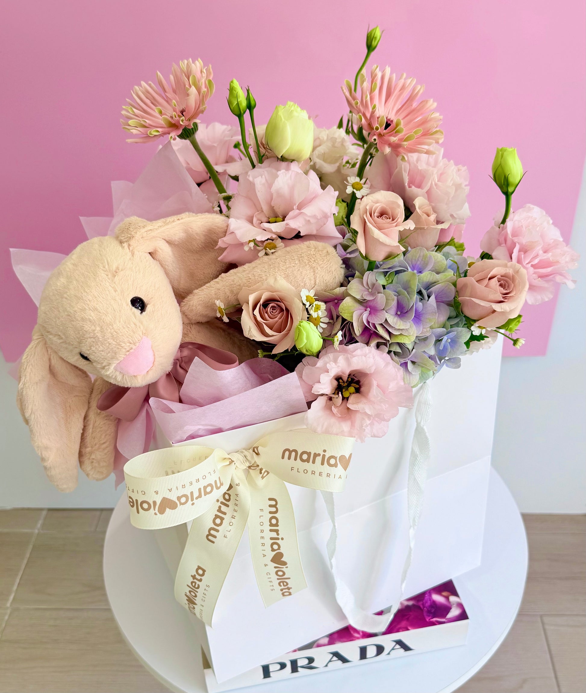 Divino nuestro bolso va con un conejito baby y un jardín de flores espectacular montado sobre una espuma que las mantiene siempre hidratadas. 💕🤩