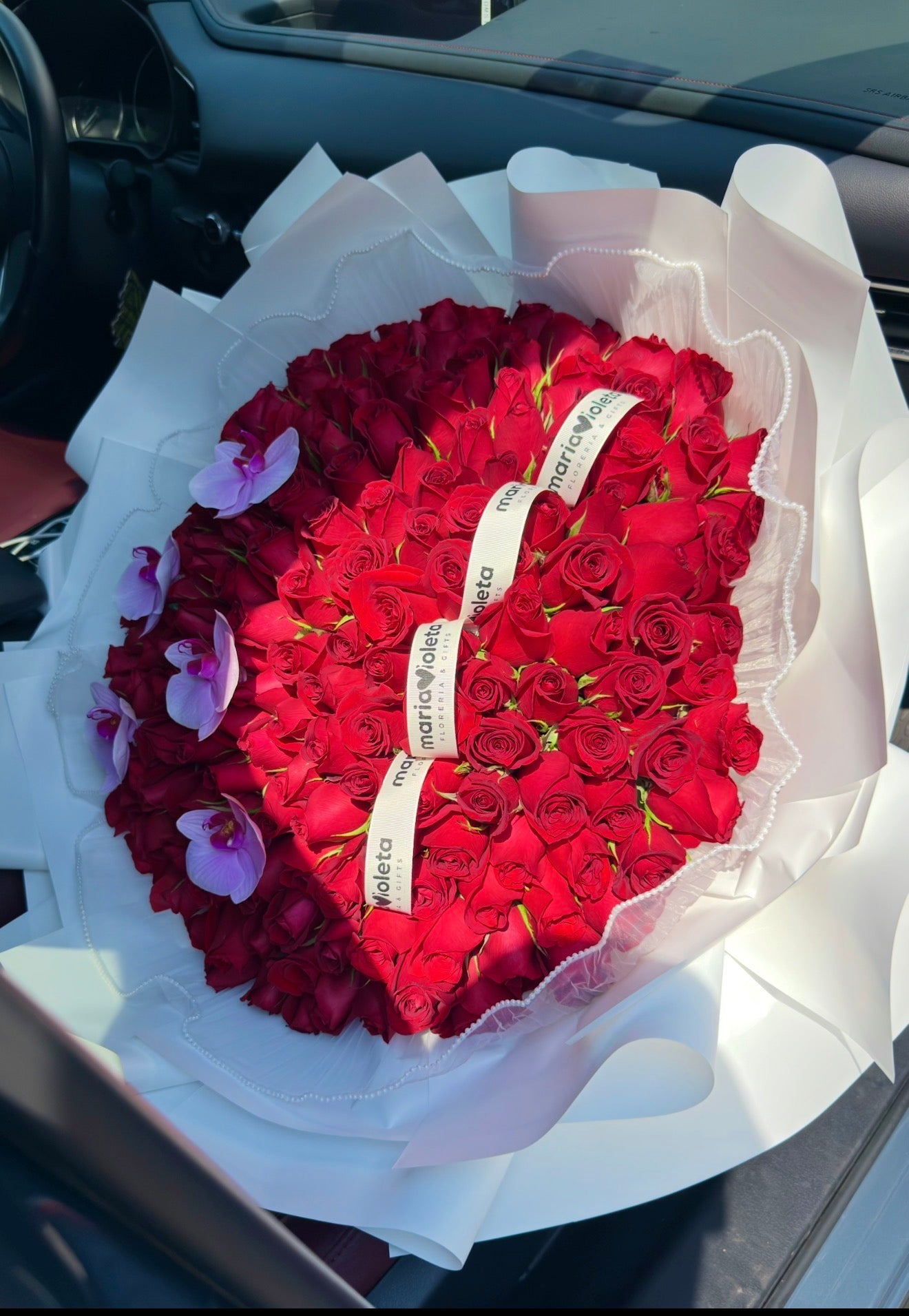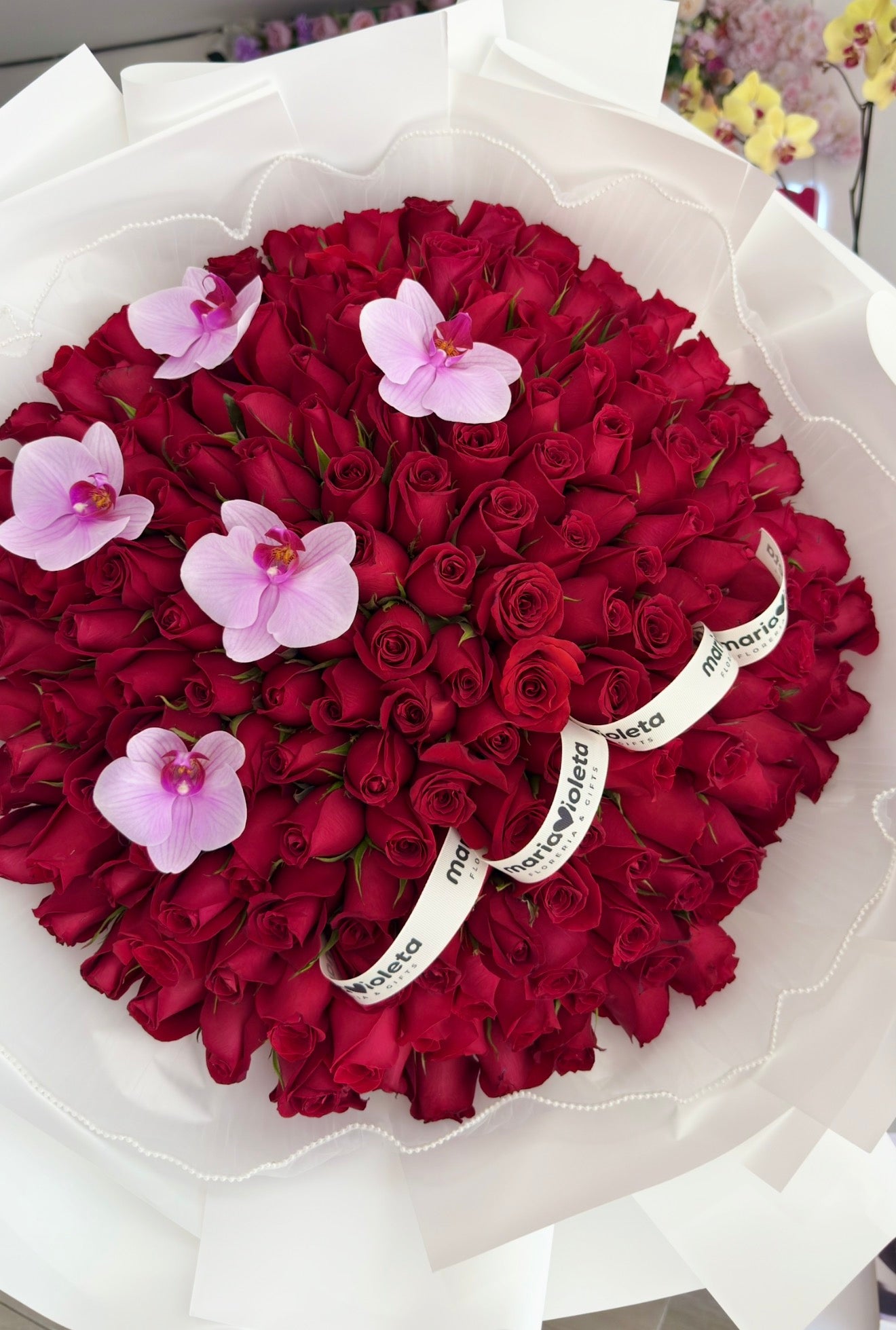 Hermoso ramo gigante de 200 rosas calidad freedom, con 5 finos toques de orquídea, está precioso, súper elegante puede ser vestido con papel color negro. ¡Tú puedes elegir el color de las rosas, su fav! 😍✨