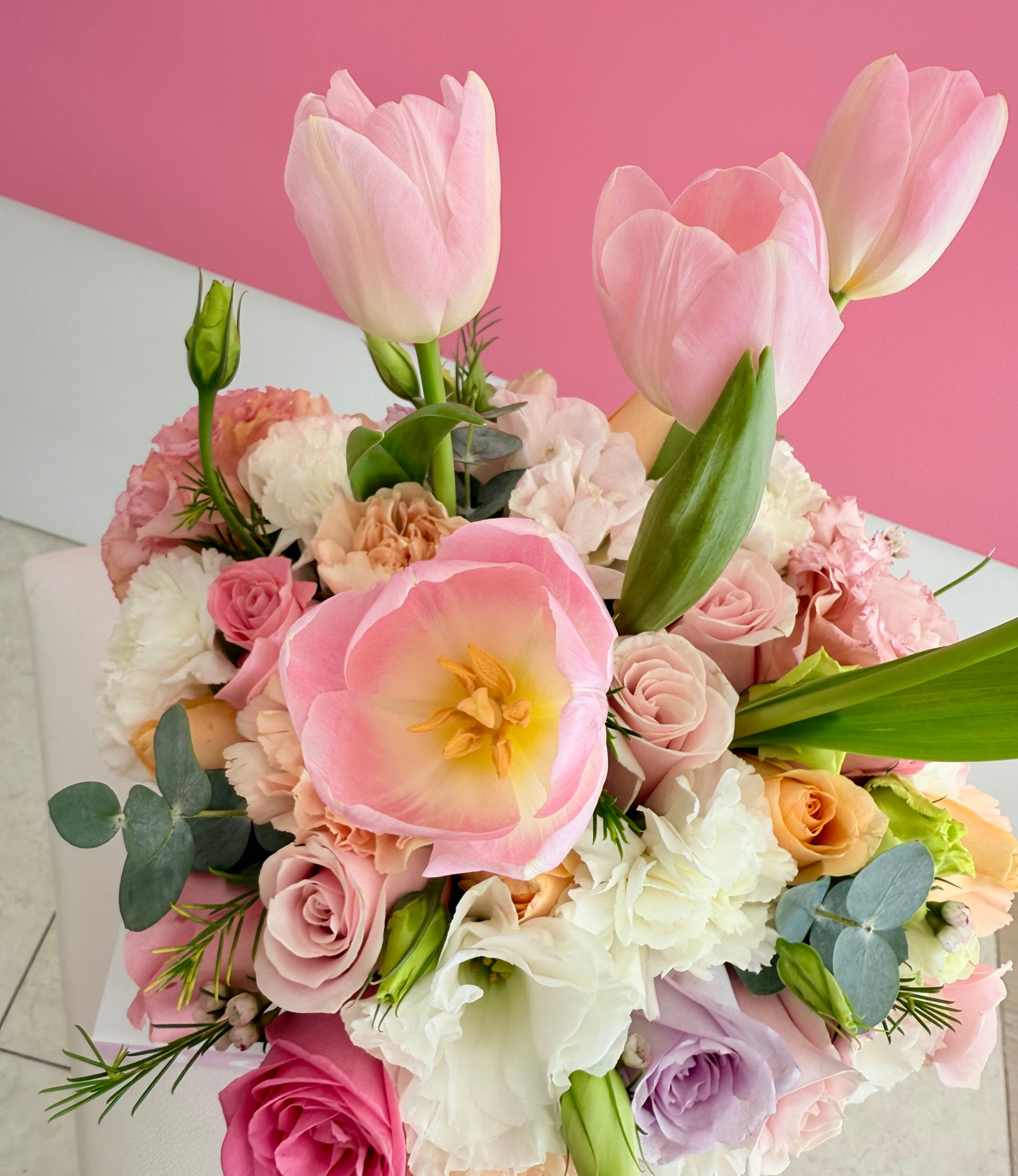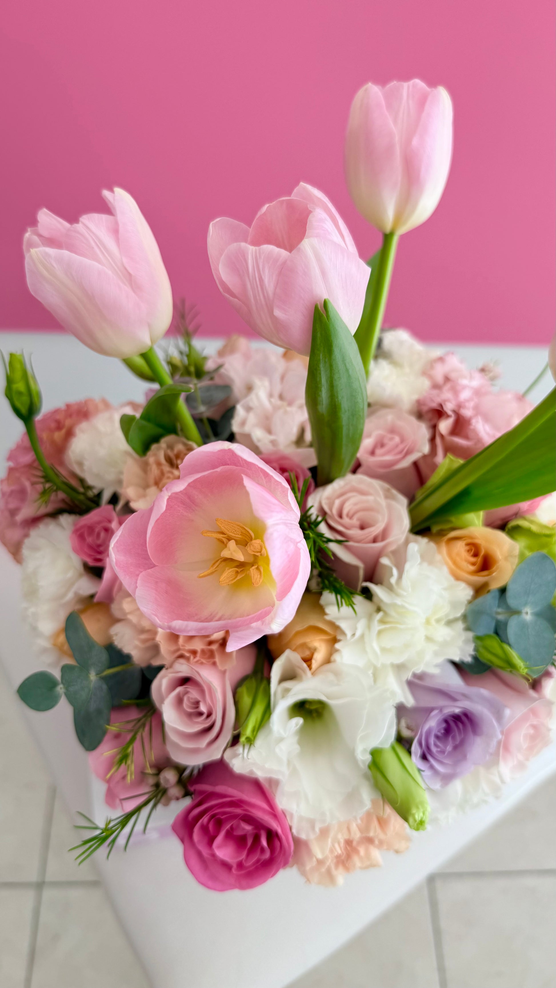 Tulipanes premium divinos con un jardín de flores del día. ¡Súper linda y elegante! 💕😍