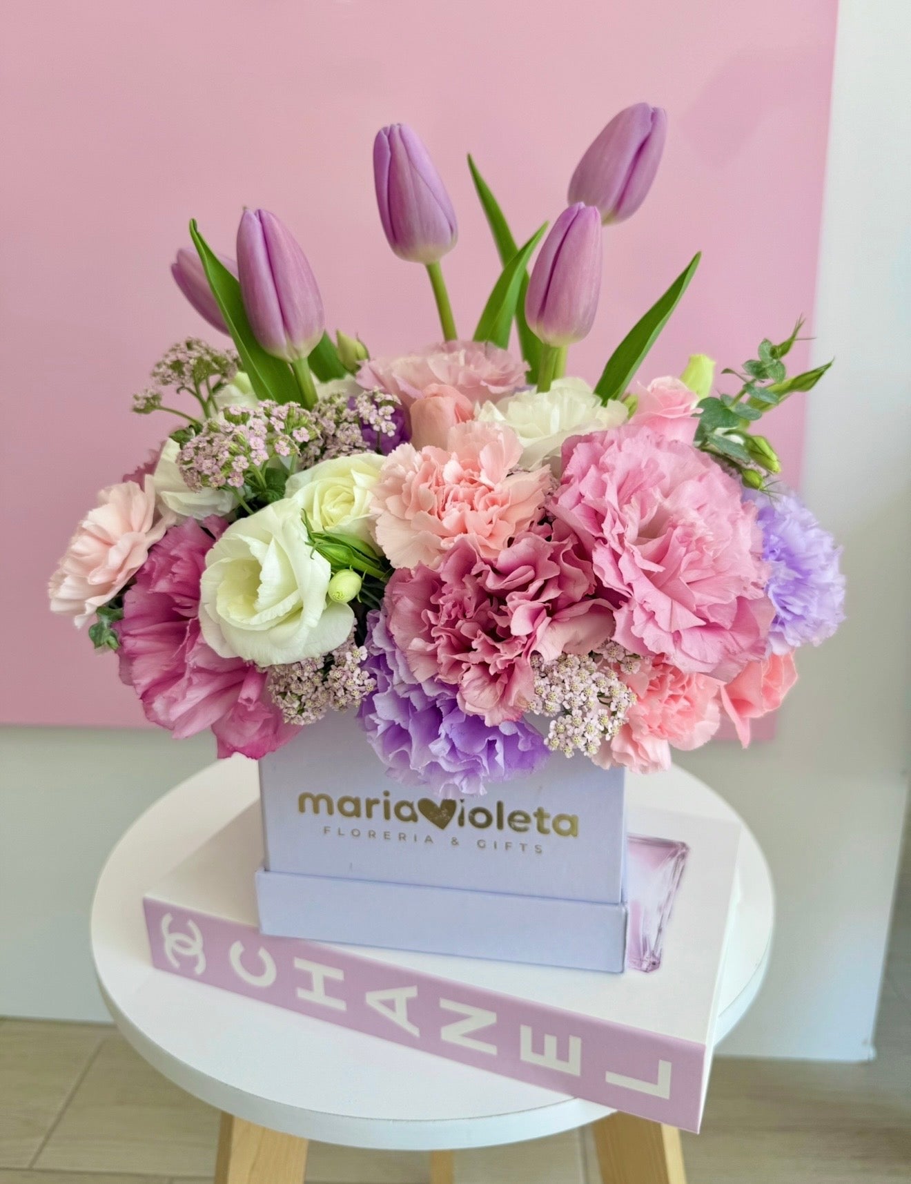 *Nuestras flores son del día; pueden variar en tamaño, color y tipo. El embalaje esta sujeto a disponibilidad pero la esencia de Maria Violeta siempre se conservará.✨