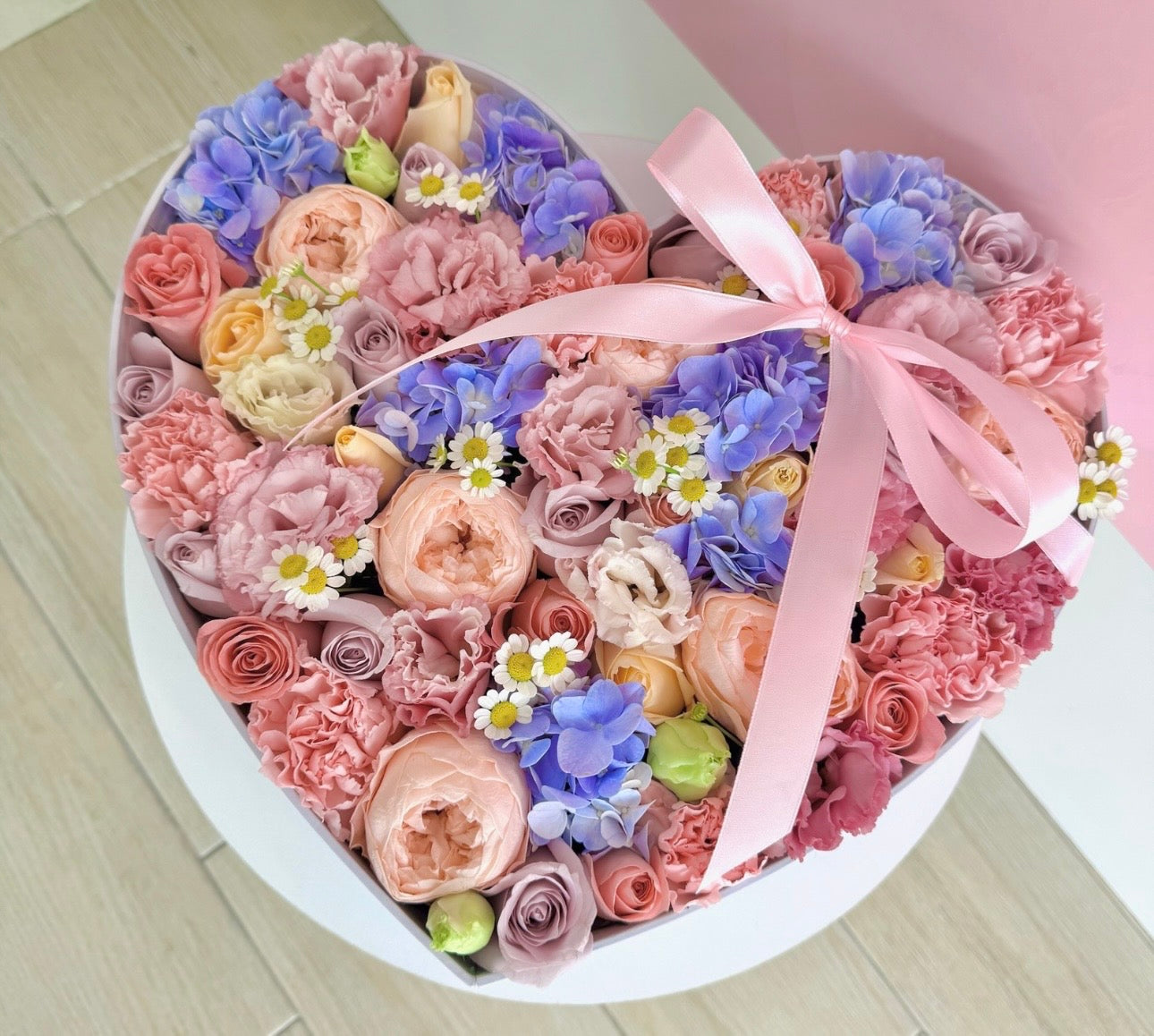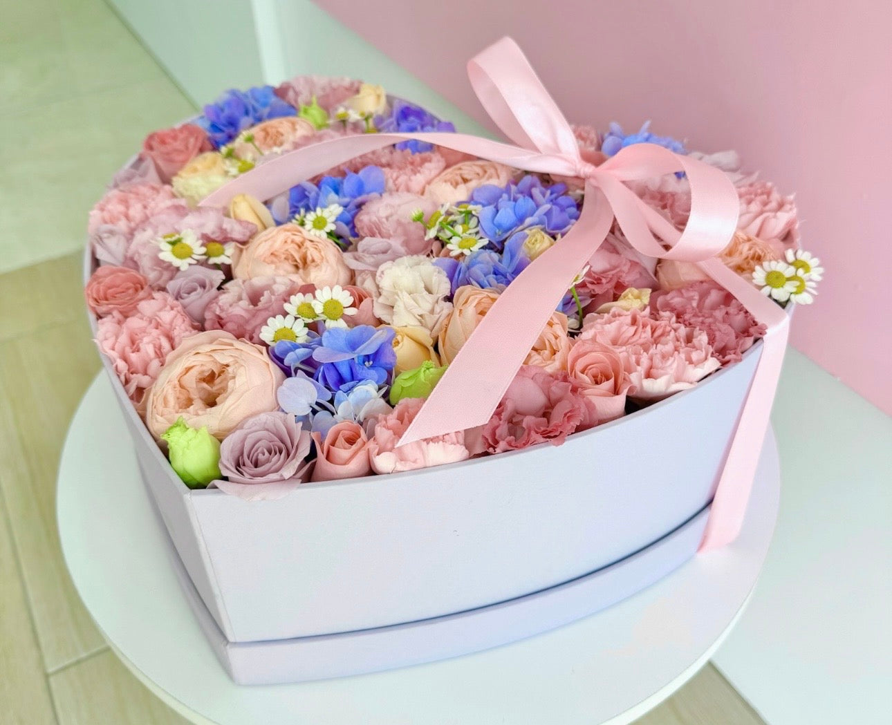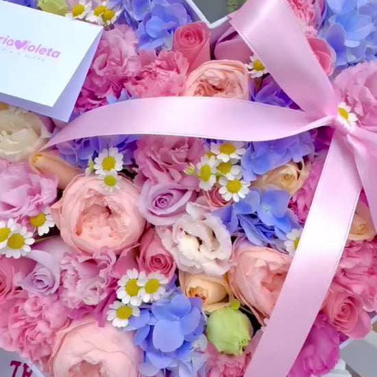 Divina box de corazón con rosas inglesas premium y un jardín de flores del día en tonos pastel. ¡Esta de lujo! 😍🫶🏻